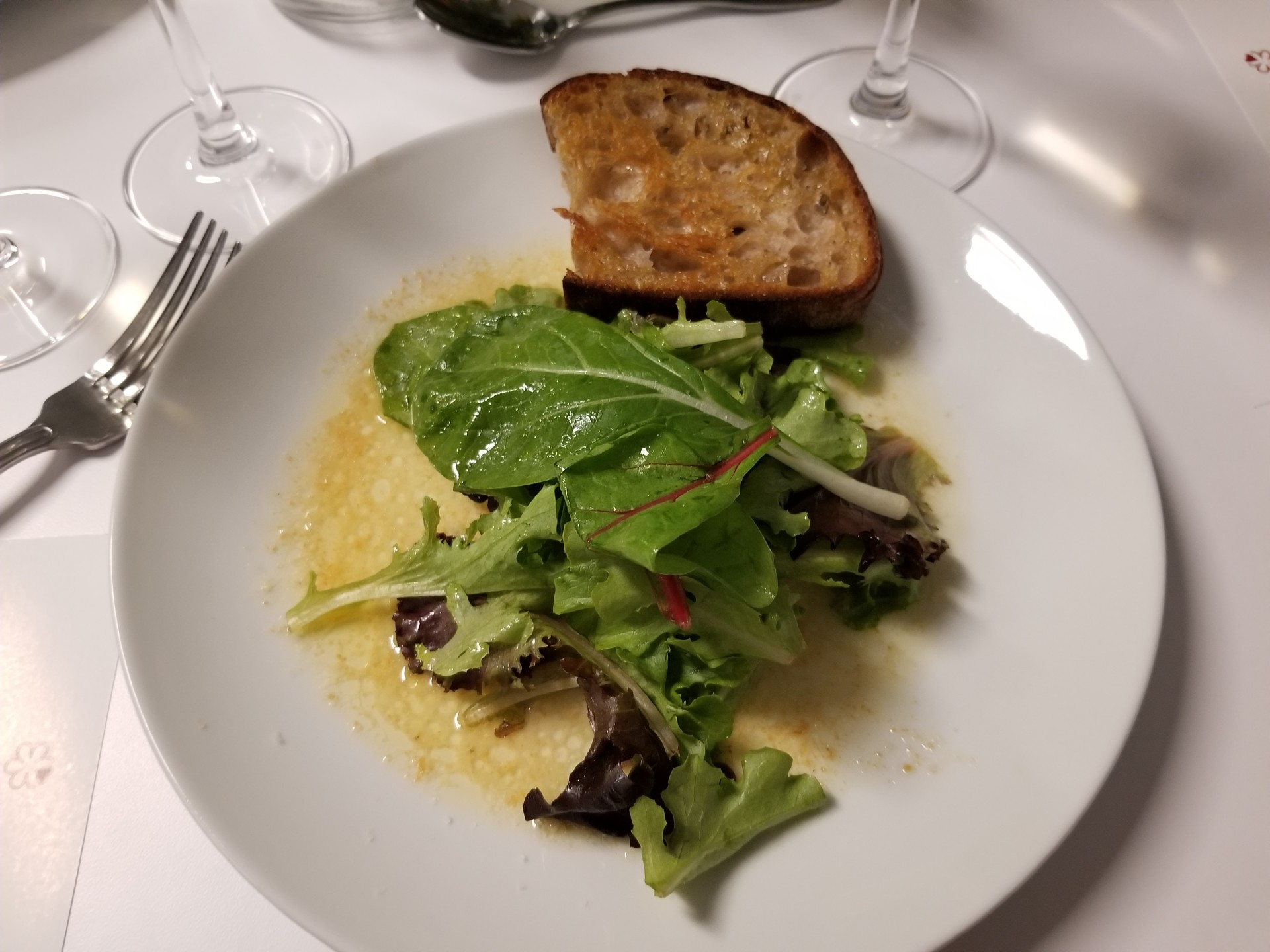 You kinda mixed this salad together to create a Caesar-y dish. It was a salad. It was pretty good. The bread, though, was extremely good, and I had to restrain myself from asking for a to-go bag. The chardonnay, like most chardonnays, was good but not really my thing.