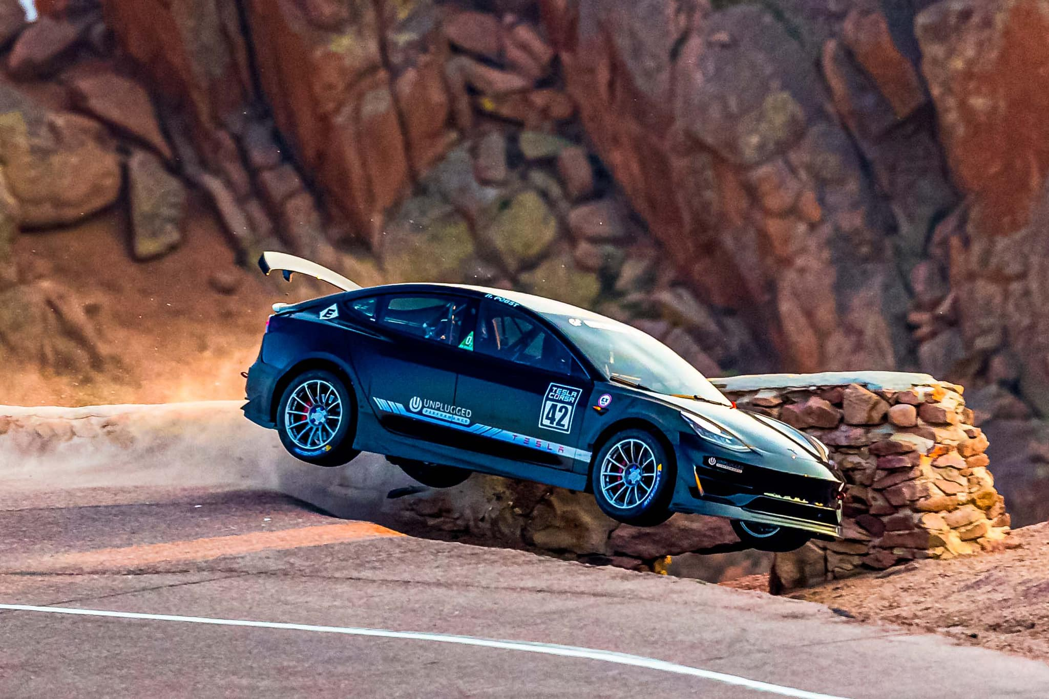 Misfortune struck Unplugged's Model 3 on its first to run on the upper section. Coming into the most accurately descriptive name for a corner — Bottomless Pit, named for the 1,200-foot vertical drop just the other side of it — Randy hit a serious bump in the braking zone that catapulted his EV through the air and into the low wall that saves the guys who get it wrong from certain death. Fortunately, that wall did its job and Randy walked away from the crash unscathed.
