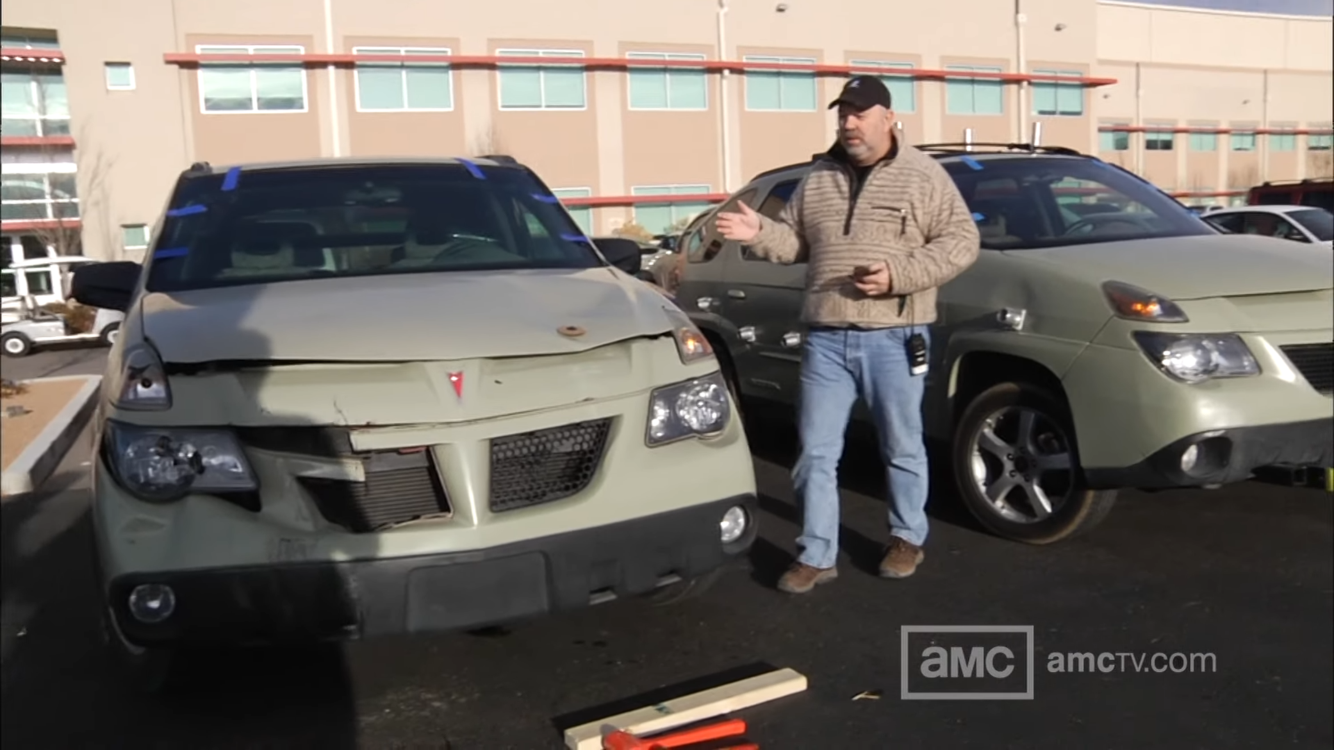 Walt's crossover wasn't even a factory color offered by Pontiac — the show had its Azteks repainted in a faded gray-beige-green tone, a color no one would notice out of the corner of their eye. The Aztek came in bright, in-your-face colors when new (including a very good yellow), and that just wouldn't have fit a mild-mannered high school teacher.