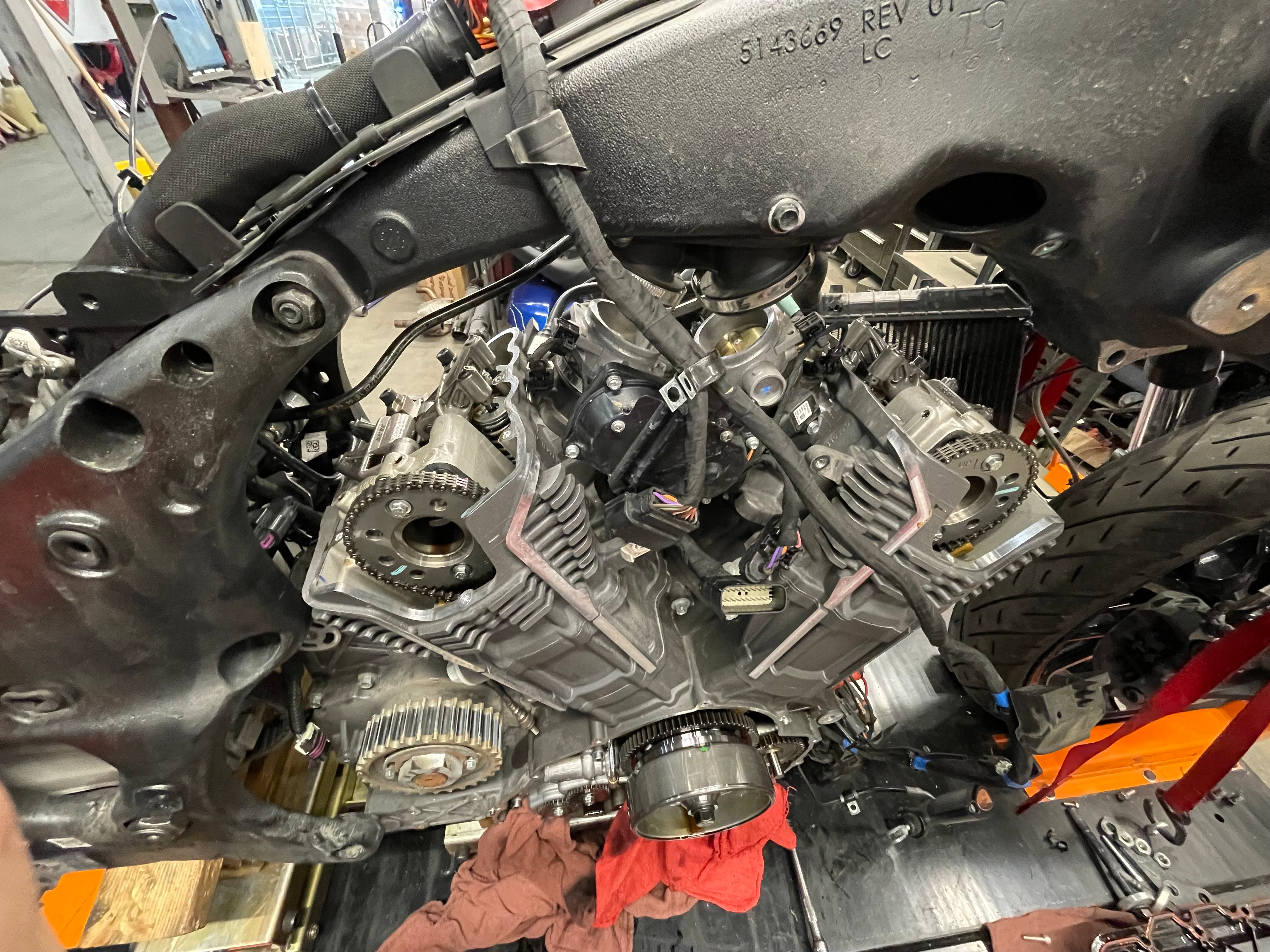 Around lunch on Friday I stopped in again to see what progress had been made that morning. The bike was starting to look like a bike again. The engine was buttoned up and back in the chassis, the tune had been fed into the computer, and the hi-po intake was installed. From there it was just a matter of putting things back where they belonged.