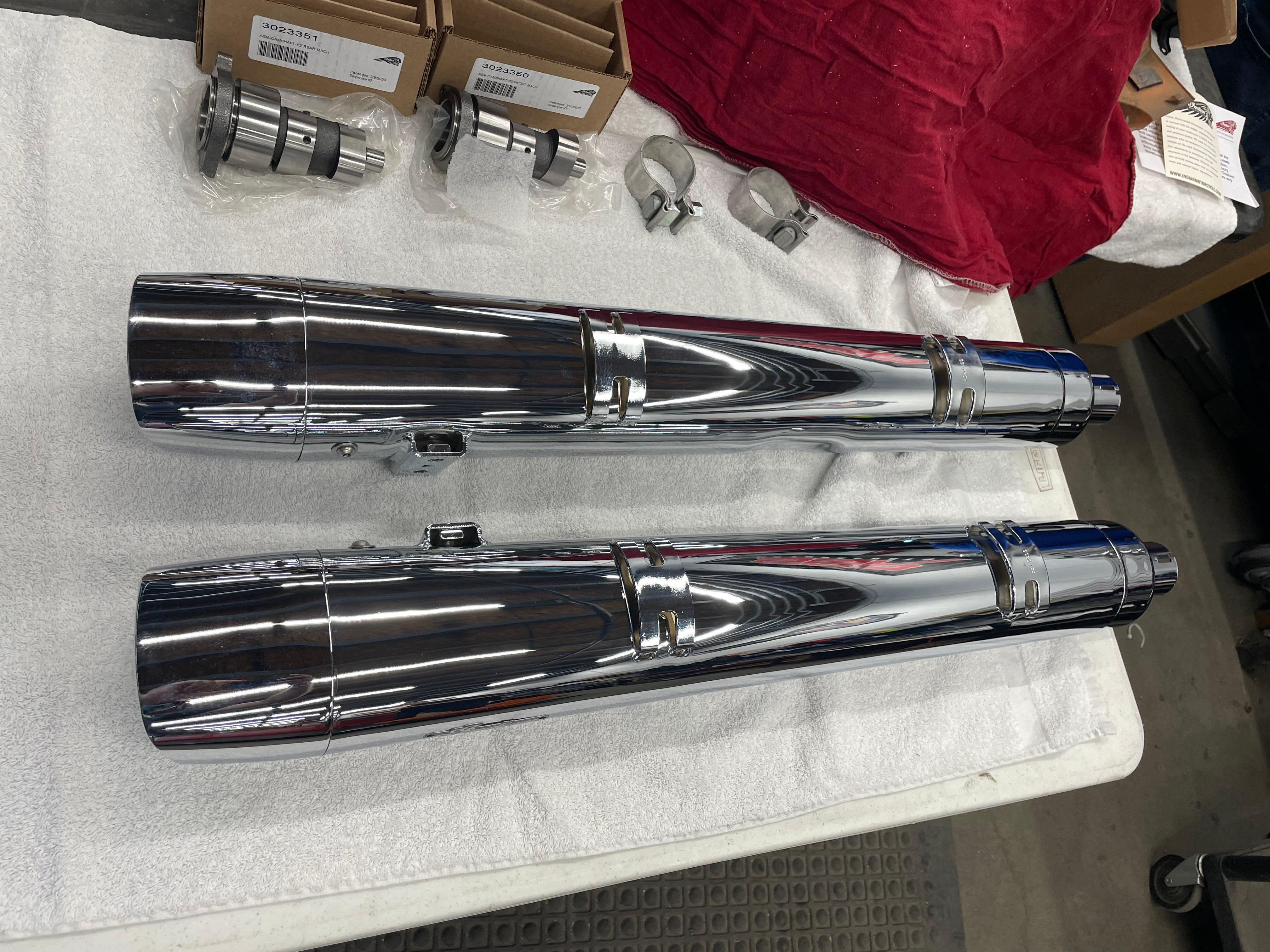 Before Todd removed anything from the bike, we went through all of the new parts together to see what was what. The packaging is fairly nondescript, but the performance slip-on mufflers are easily the coolest piece of this puzzle. Available in both chrome and black, these pipes are a nice big high-flow setup with an attractive oval tip.