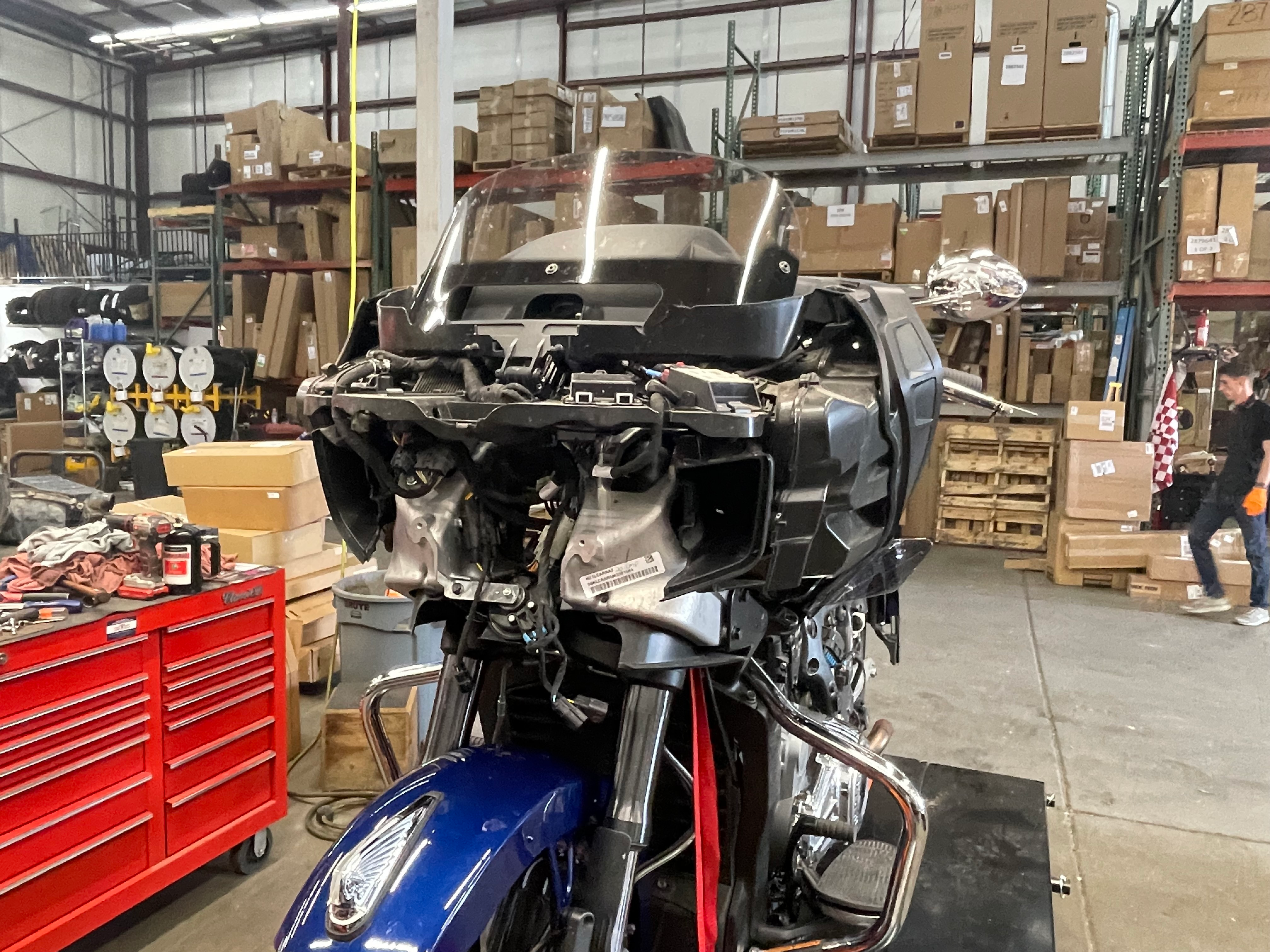 When I came back a few hours later, a whole lot of progress had been made. I was most surprised to see the front headlight and fairing removed from the bike, but apparently this was necessary to gain access to the bike's ECU.