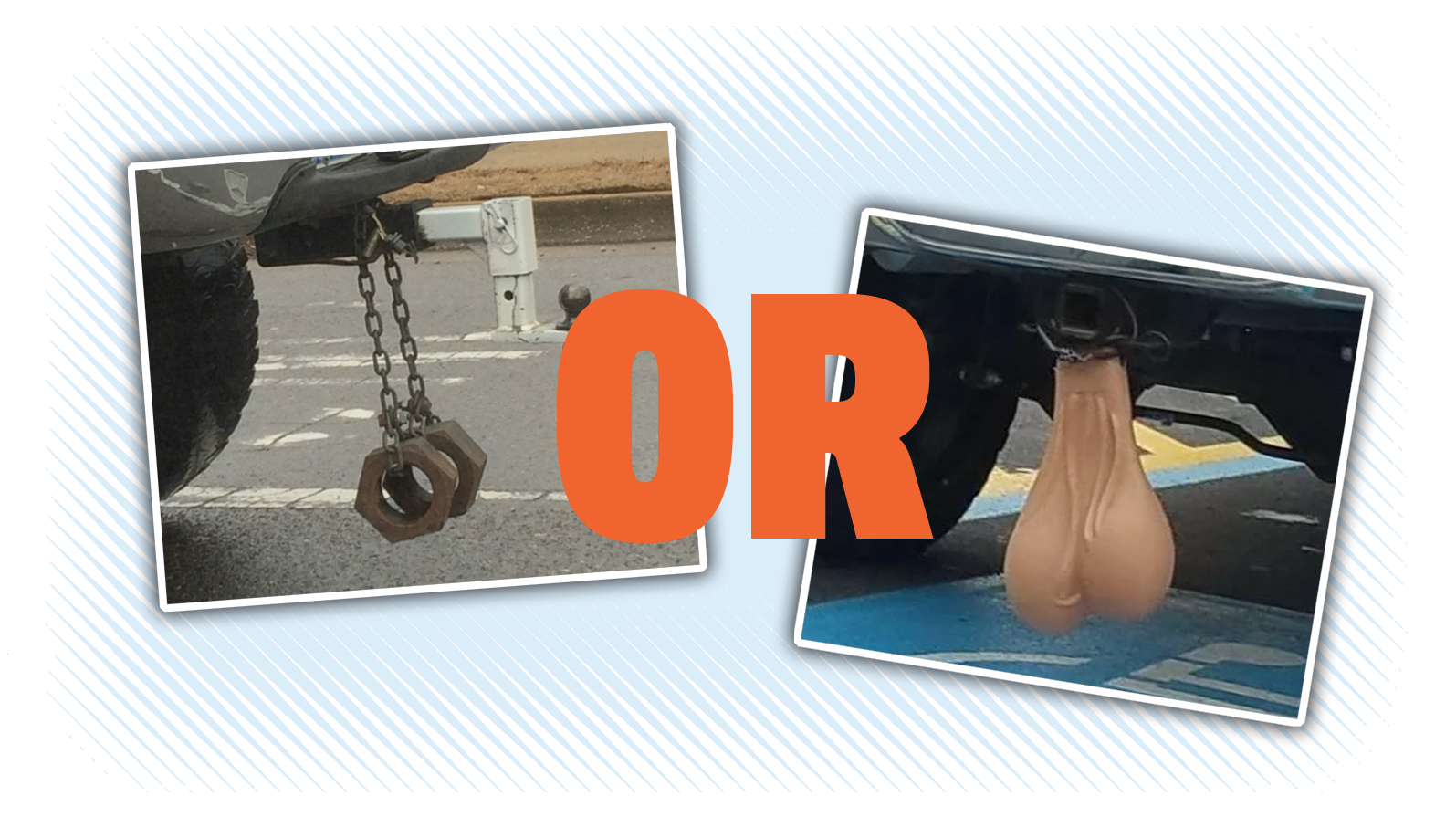It's the Monday after a holiday, and that can only mean one thing: Raph and I are at each other's throats regarding a question about scrotums. And not just any scrotums: the synthetic scrotums that deeply lost people hang from the back of their trucks to suggest that their trucks are male and have the organs that mammalian life uses for reproduction. Yes, Truck Nutz. It seems there are two very divergent kinds, and our own Raphael Orlove and I disagree which are worse.