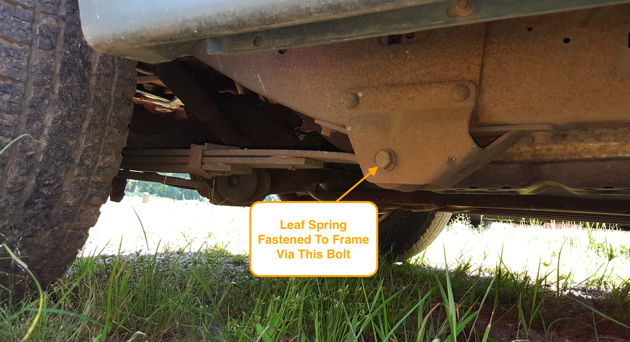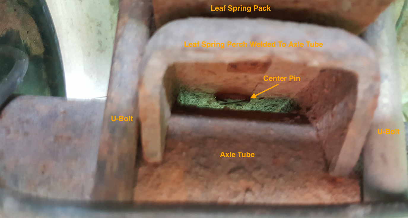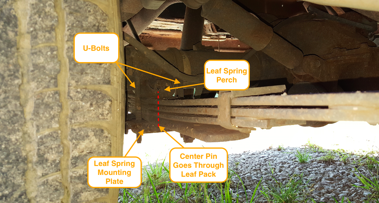 "In the mounting pad on the axle [labeled leaf spring perch above]," Lehto told me, "there's a hole. When you install the spring, you make sure that the center bolt sticks through that hole, and that kinda keeps [the axle] from shifting fore and aft."