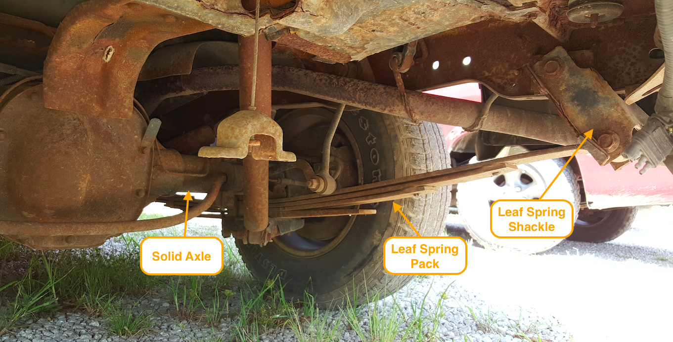As shown above under a random Explorer that I slid under in Kentucky (yes, I risked being shot to take these pictures), four leafs together make up a leaf pack, which is fastened to the underside of a solid axle.