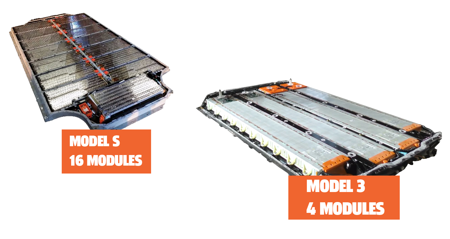 The Model S has a battery pack with 16 individual modules of battery cells, while the later Model 3 reduces that number to four long modules. Having separate modules could be a benefit if they were easy to swap out individually, but they're all sealed inside the battery pack, so that's not the case.