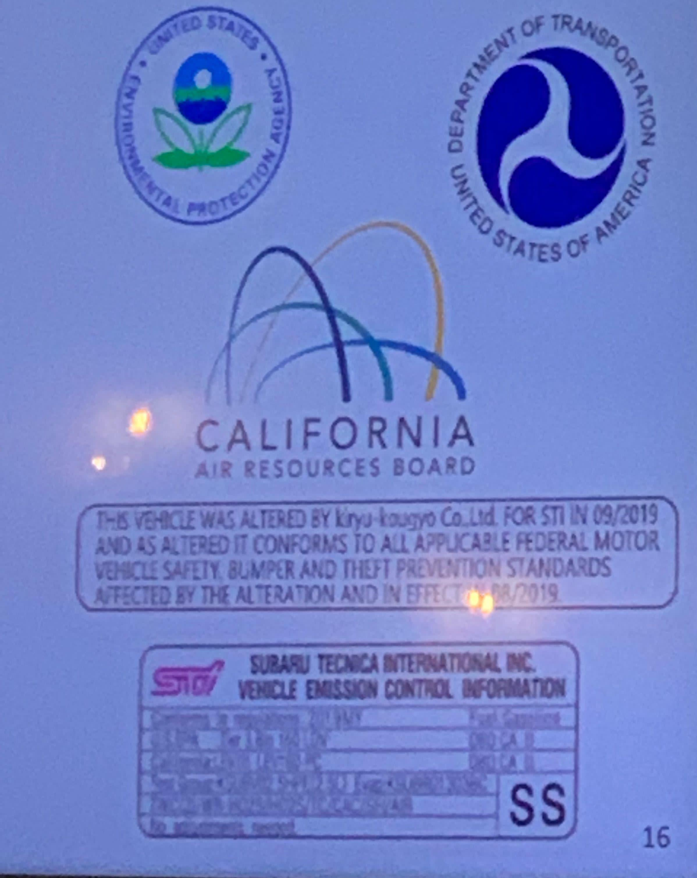 STI executives, including Yoshio Hirakawa, the outgoing President of STI who spoke to me at the drive event, was proud that his organization achieved U.S. certification, and that it would be STI listed on the car's certification labels inside the driver's door, which you can see below: