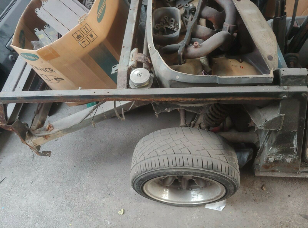 ...removed the body and started to make a hot rod / rat rod removed the engine as it was no good replaced it with a1.8 MX5 engine and box( he bought a complete MX5 drove it for 2 days to make sure it was ok .when mx5 engine was fitted.he dummied up the propshaft..
