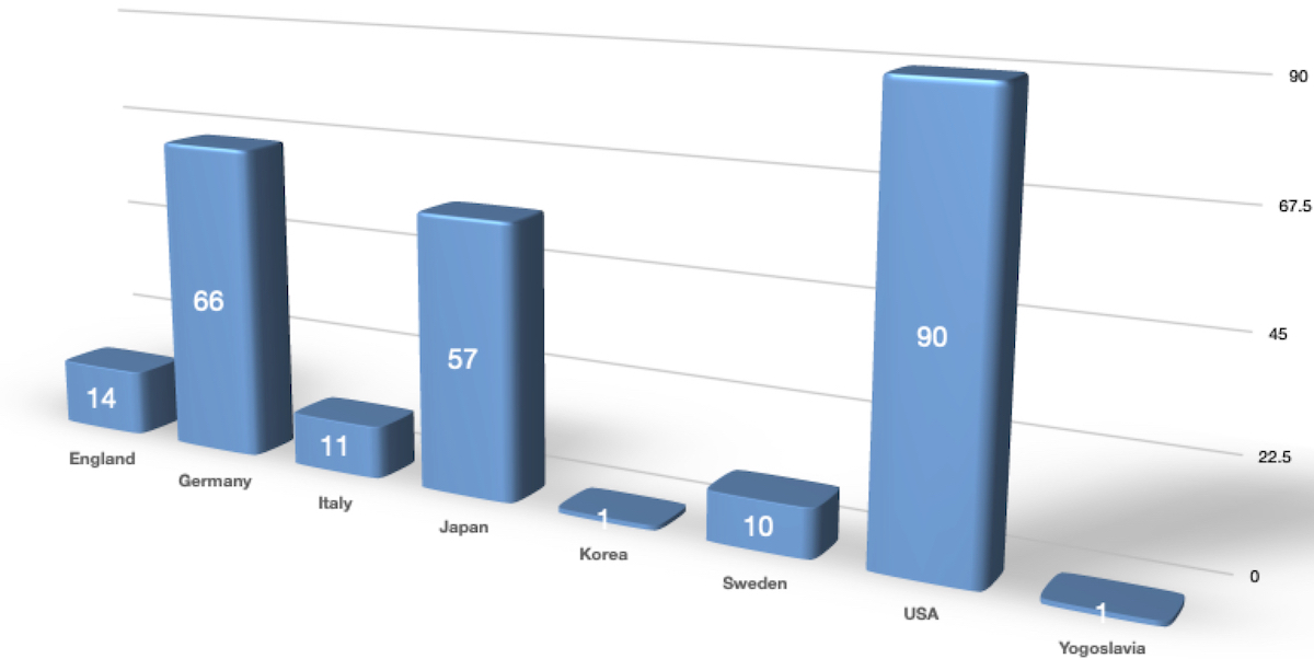 The chart above is perhaps notable not for the car-building nations represented, but for those that were under-represented or excluded entirely. We looked at a lot of cars from the U.S. (90) and from Germany and Japan (66 and 57, respectively), but we had no candidates from France and only one each from Korea and Eastern Europe.