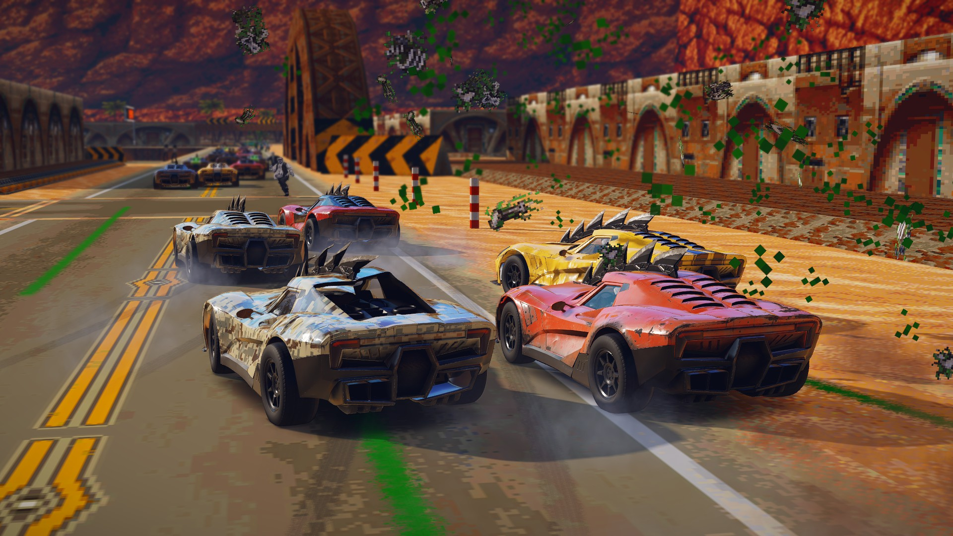 Carmageddon invited players to plow into pedestrians with their death machines; Wreckfest's take replaces those innocent bystanders with wandering zombies and zombie livestock, modeled as two-dimensional sprites in the series' '90s aesthetic. They turn into pixelated green goo when you hit them, and make the requisite guttural, groaning noises on impact.