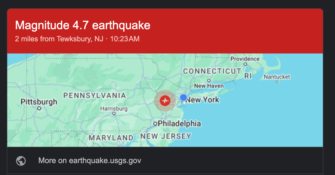 So, I'm glad I'm not losing my mind. As it turns out, a magnitude 4.7 earthquake just went off in northern New Jersey about 50 miles away from New York City. That shit was wild.