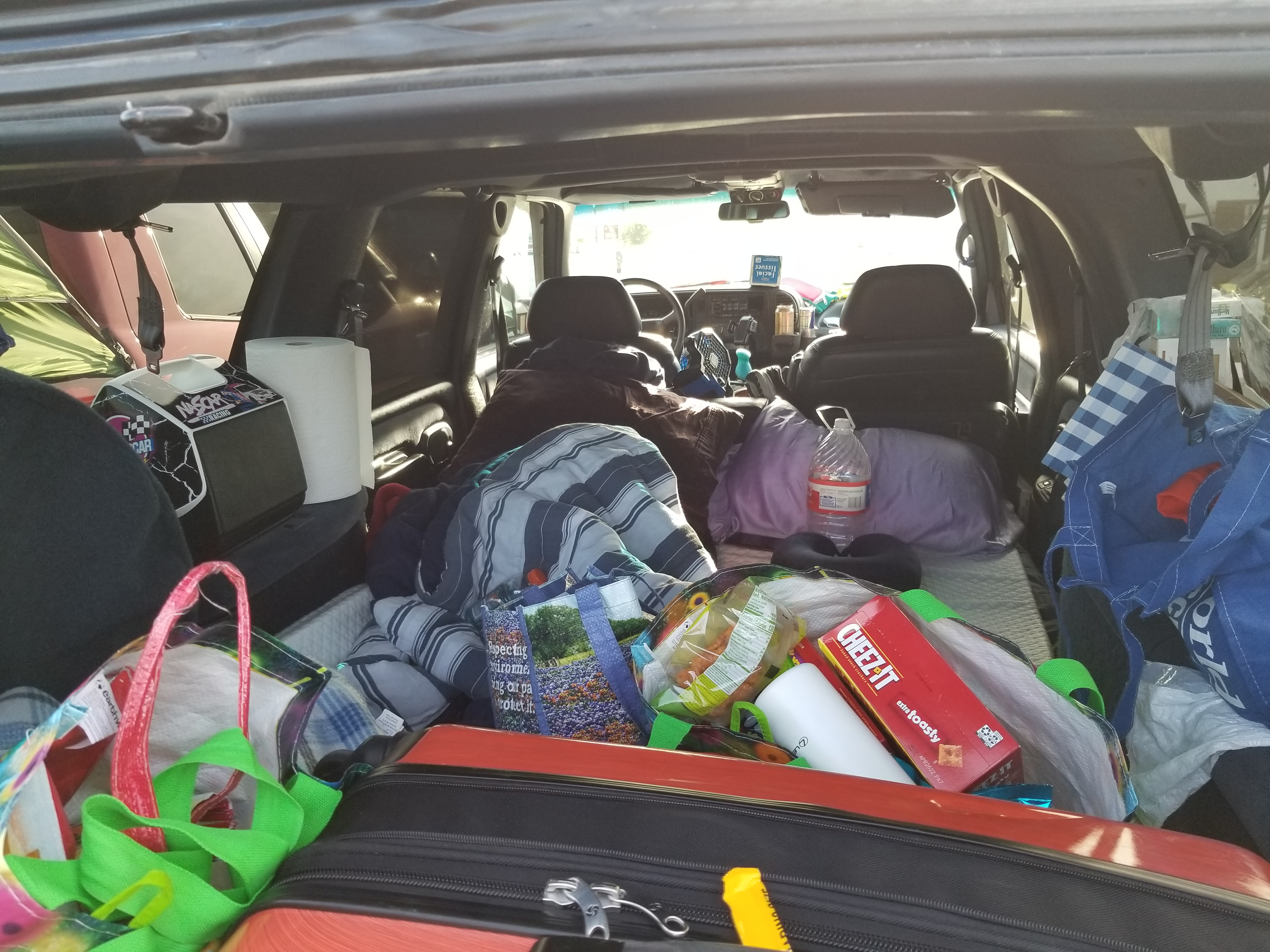 I'll be the first to admit that our camping setup could be refined. We showed up with a massive suitcase and tons of loose bags of supplies, like toiletries and snacks. That meant that, every day, we ended up reorganizing our setup. If we wanted a bag of chips or a water, we had to throw our bags around and dig through things. Then, when we wanted to sleep, we had to stack up all the bags to sleep. On our next adventure, we'll invest in some easily stackable boxes or some drawers. We just didn't have the time to really organize for this trip; we got the Suburban back on Wednesday, threw everything in, and ran out.