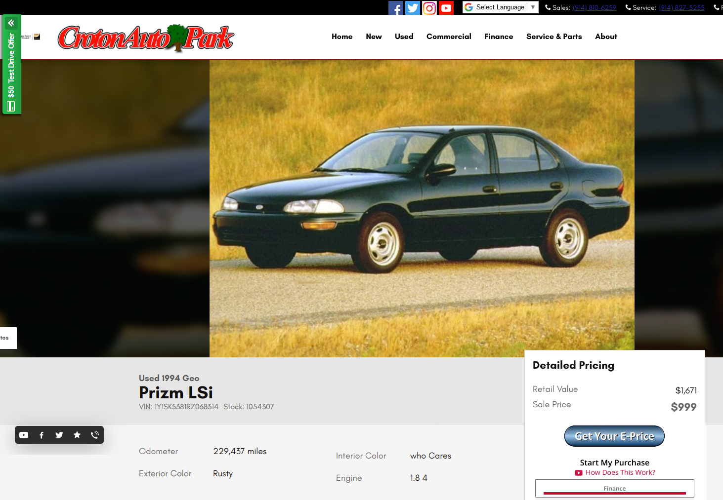 A reader sent me a tip on this 1994 Geo Prizm LSi for sale at a dealer in New York. Whoever made the listing clearly knows what they have, with an exterior that is listed as "rusty" and an interior of "who cares." They also note that "tetanus shots are required" before a test drive.