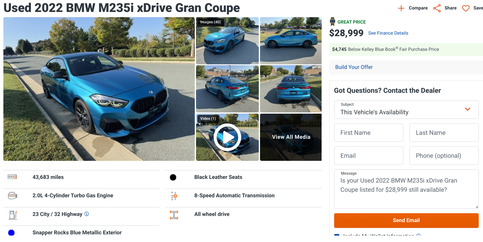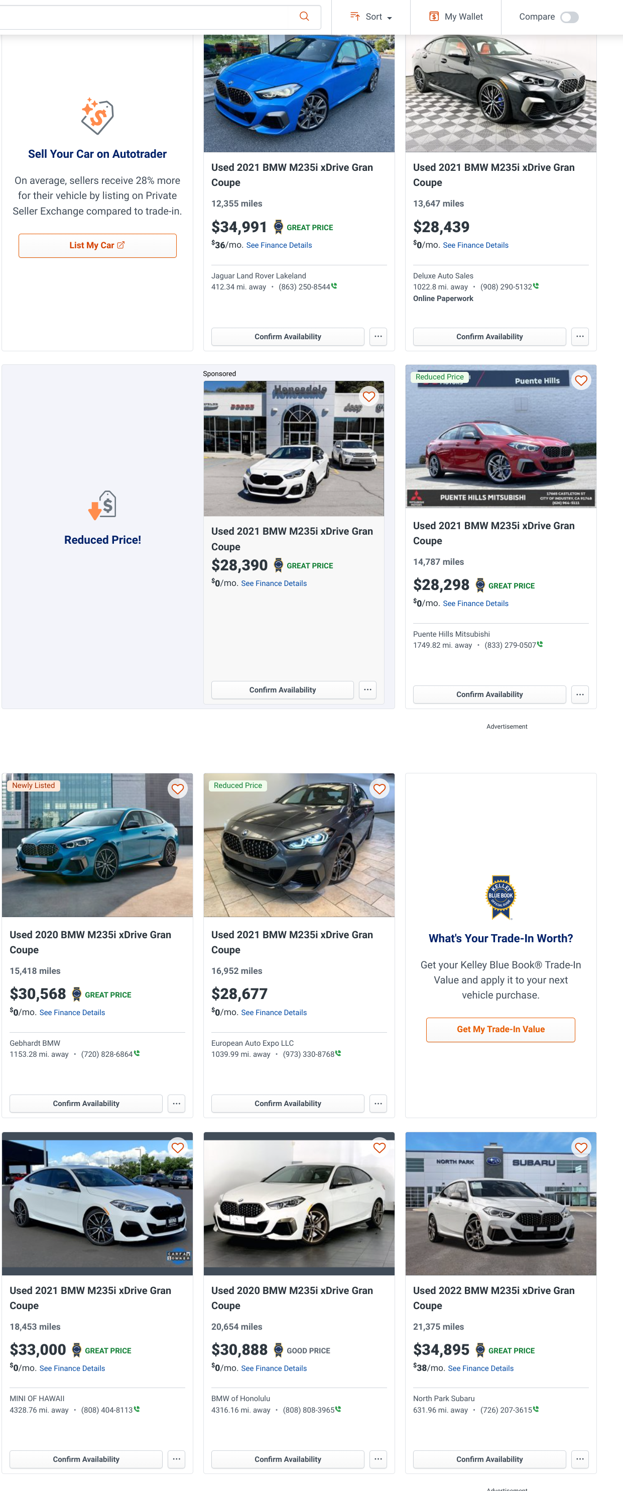 Nationwide there are about sixty M235xDrive units in the sub $35,000 price point. Many of these have reasonable miles and some even come with a BMW Certified Warranty. Most of these cars would have had an original spec well over the $50,000 mark.