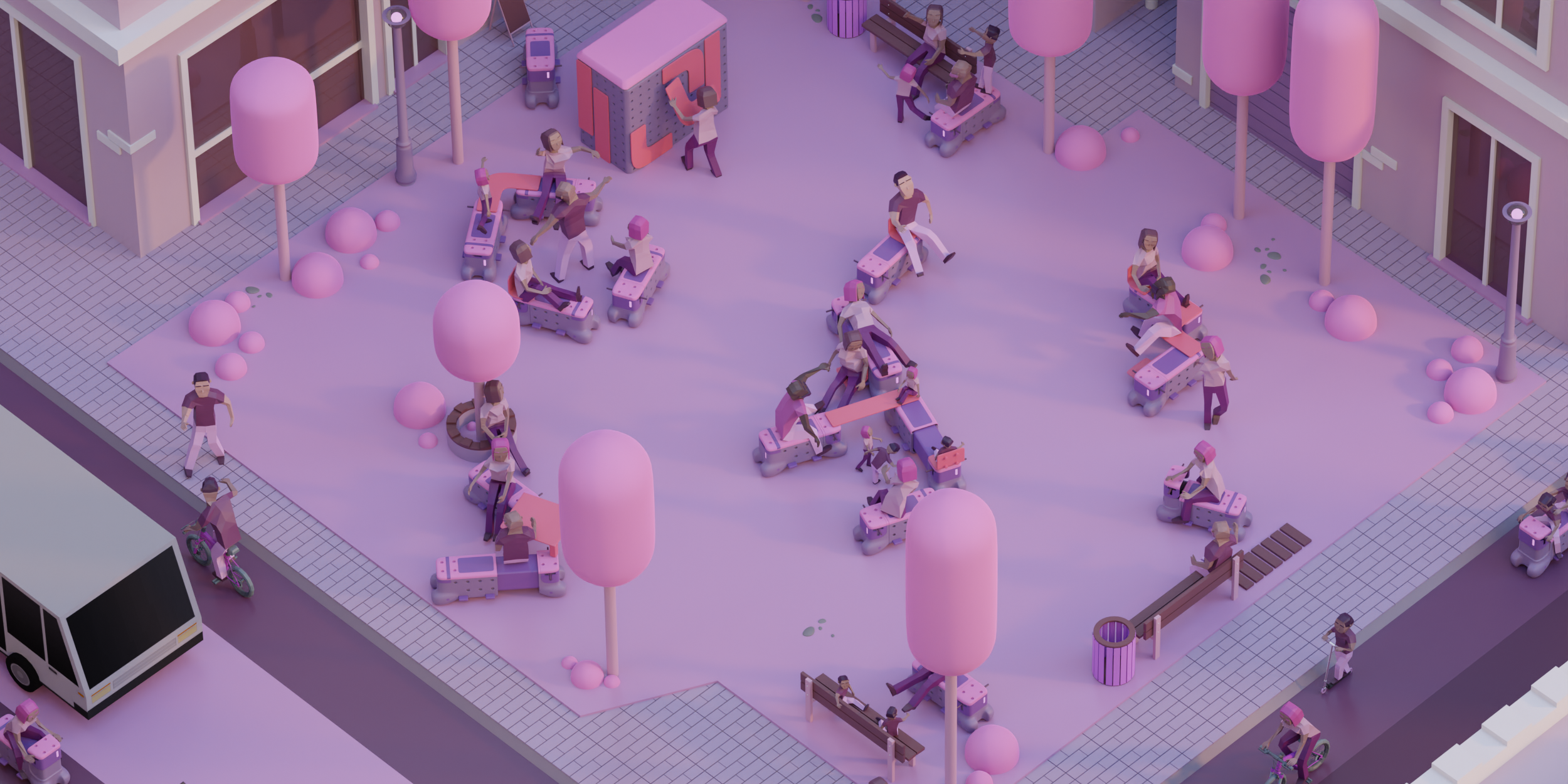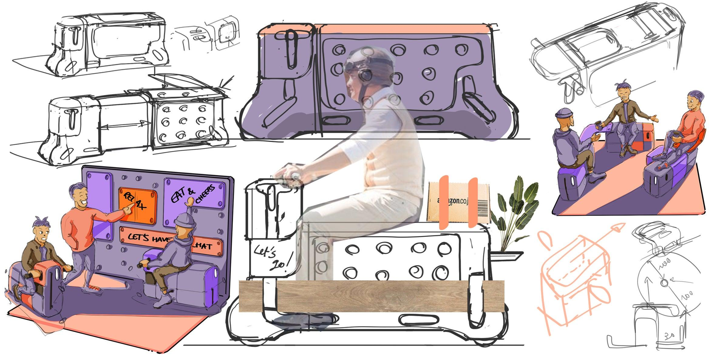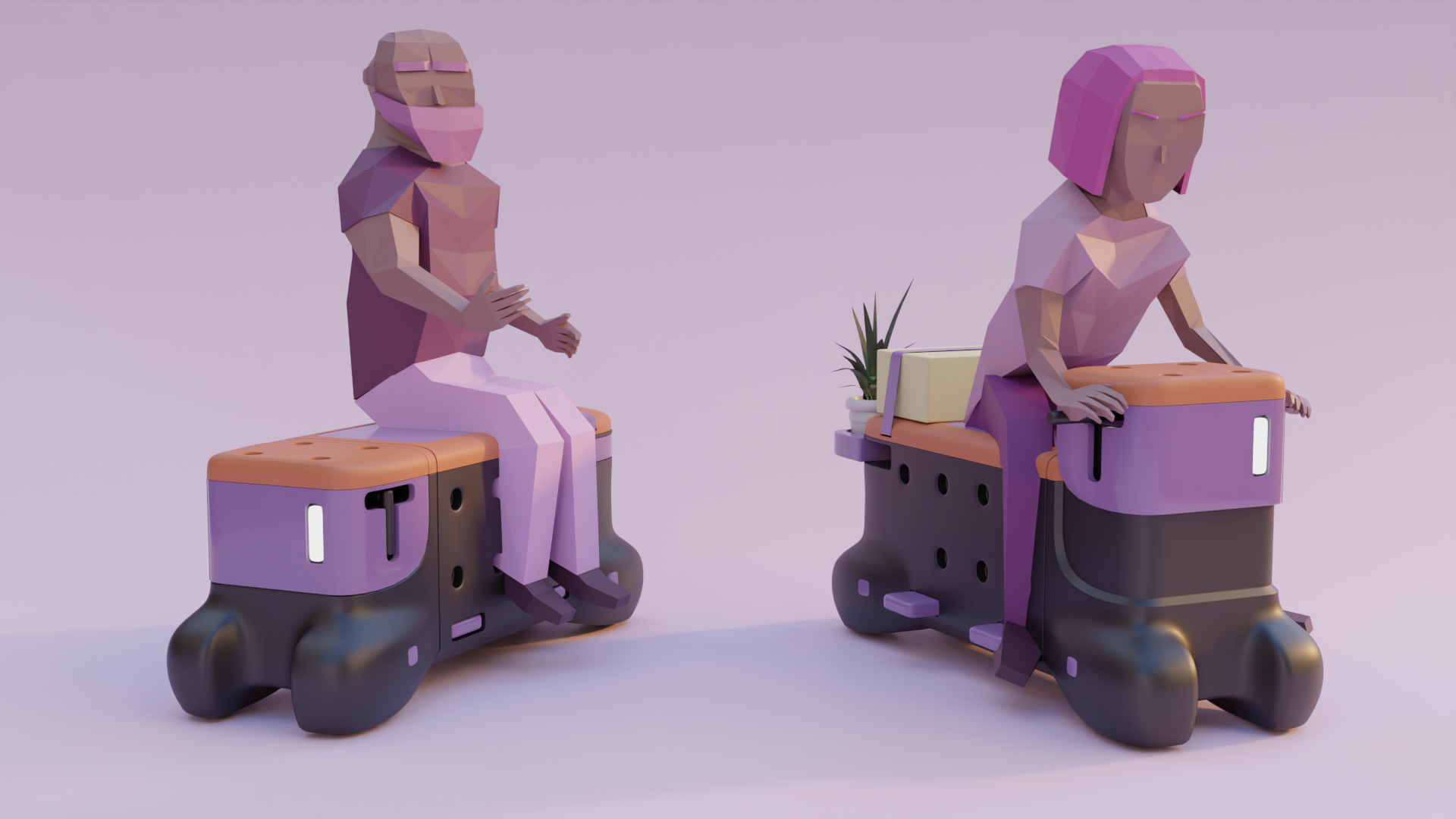 In mobile mode, the sit-on scooter is for up to two people, with a maximum speed of 20 km/h. A hatch in the middle provides space for luggage, while stretching bands on the back and sides enable users to transport small and long items. Users can locate and book a bench or sit-on scooter using the dedicated app.
