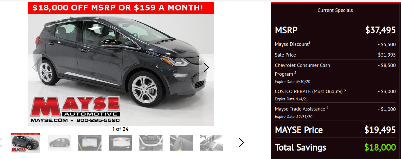 But even if you didn't have the Costco and trade discount a combined total of $14,000 off a car with an MSRP of around $37,500 is a screaming deal, not to mention your fuel savings. While the Bolt may not be the ideal car for all drivers, it can be especially compelling for those folks who are now working from home and just need a car for short drives.