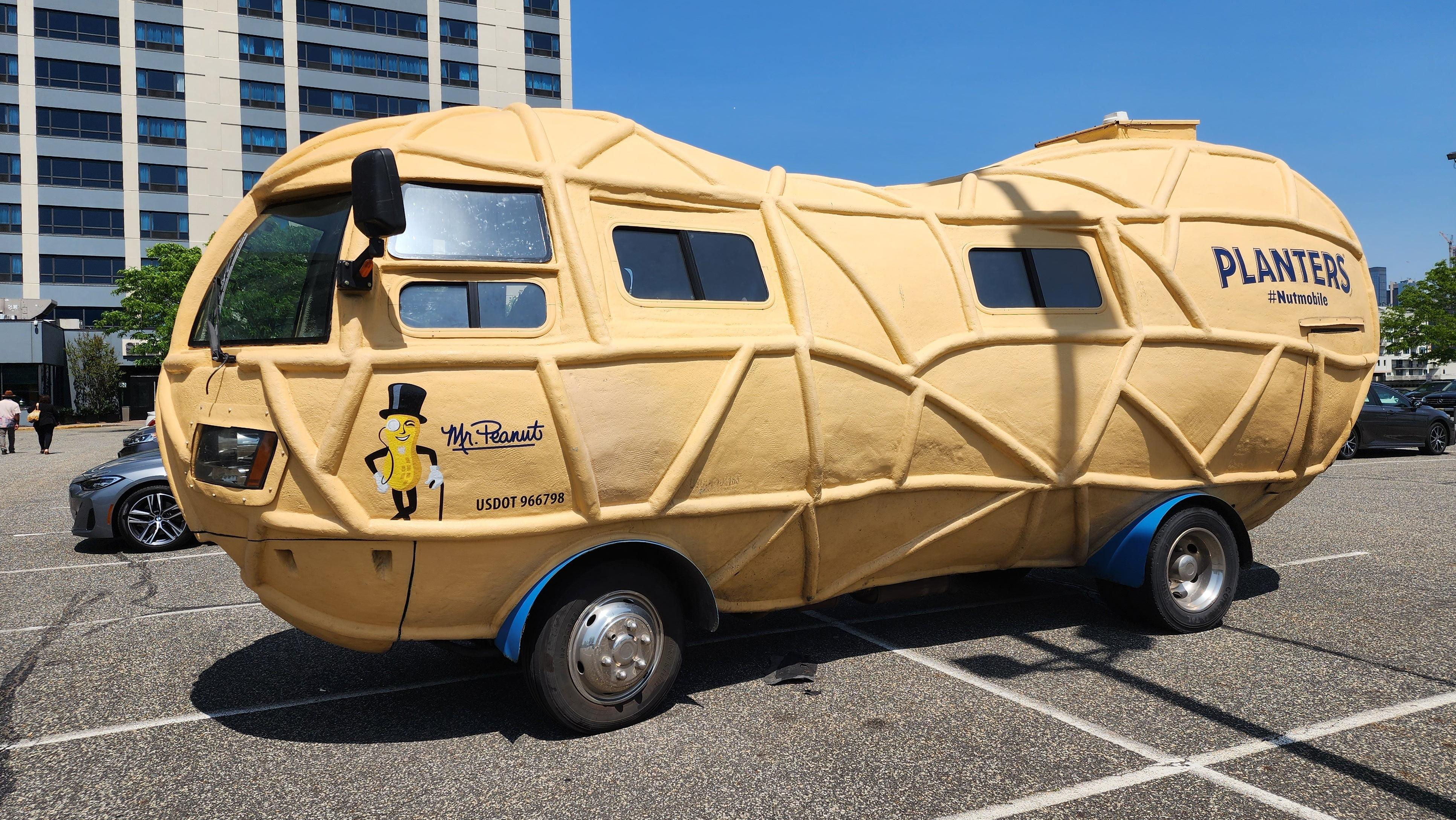 The Nutmobile is a 26-foot-long gigantic peanut on wheels, so anyone who applies shouldn't go nuts when driving a large unwieldy vehicle — it's also 8.5 feet wide and 11.5 feet tall, and it weighs 13,000-pounds. The Nutmobile is assembled by Spartan Motors in Michigan and powered by a 6.0-liter Vortec V8, and it has nutty features like gullwing doors, six blue leather seats, a removable sunroof to feature Mr. Peanut in parades, and a backup camera. Its headlights appear to be from a third-generation Chevrolet Tahoe.