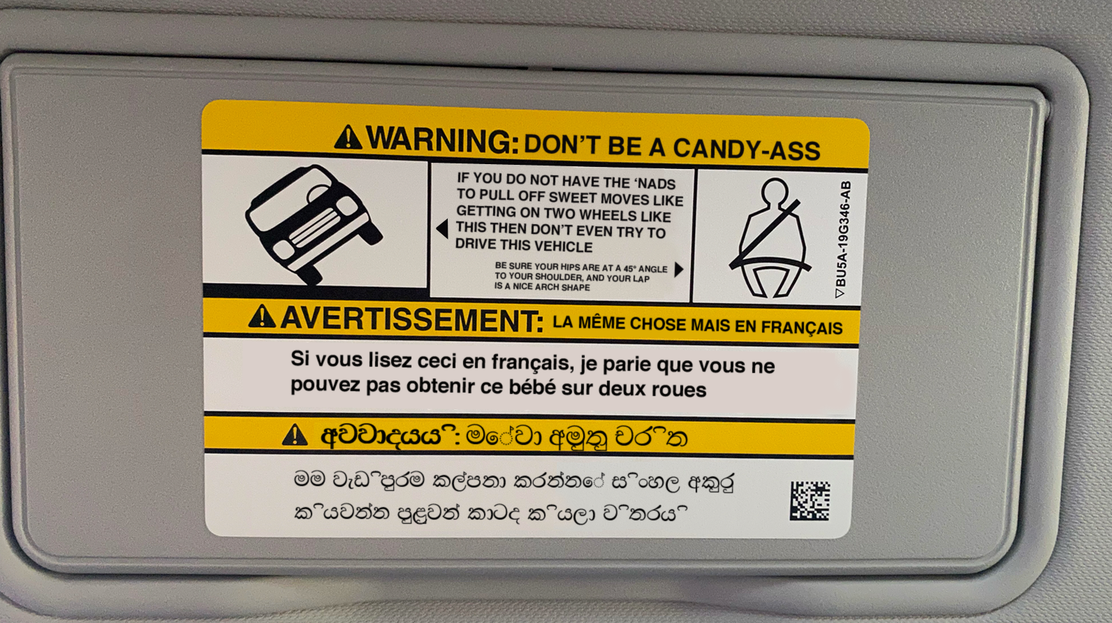 I had a press vehicle recently, and when I pulled down the visor to block the intense rays of that large, glowing orb in the sky — I want to say it's Jupiter? Anyway, when I pulled down the visor, I was confronted with this big warning label, and I realized that I'm not sure I've ever actually read one.