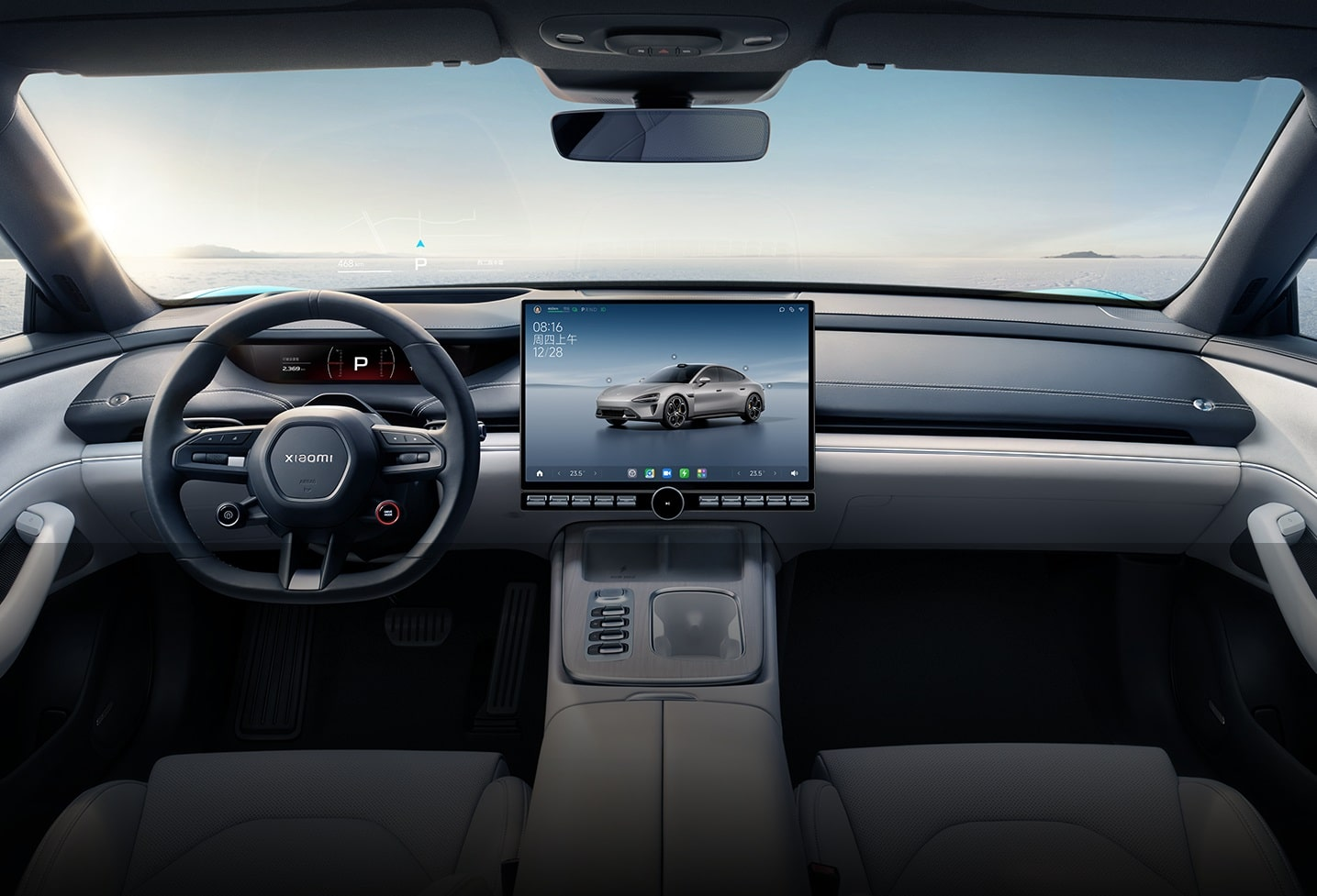 As you might expect from a smartphone company, the SU7 has a lot of tech. The interior has a 16.1-inch central touchscreen that runs Xiaomi's own HyperOS operating system, which will also be adopted by all of Xiaomi's phones and other devices, replacing the Android-based OS it currently uses. Thanks to a Qualcomm Snapdragon processor, the system is said to take less than two seconds to boot up, and it can do split-screen multitasking or cast from your phone. Rear-seat passengers can magnetically attach Xiaomi tablets to the front seatbacks, and the in-car tech can be used to control home appliances. A bit surprisingly, there are actually a row of physical buttons below the touchscreen, plus traditional steering wheel controls and stalks.