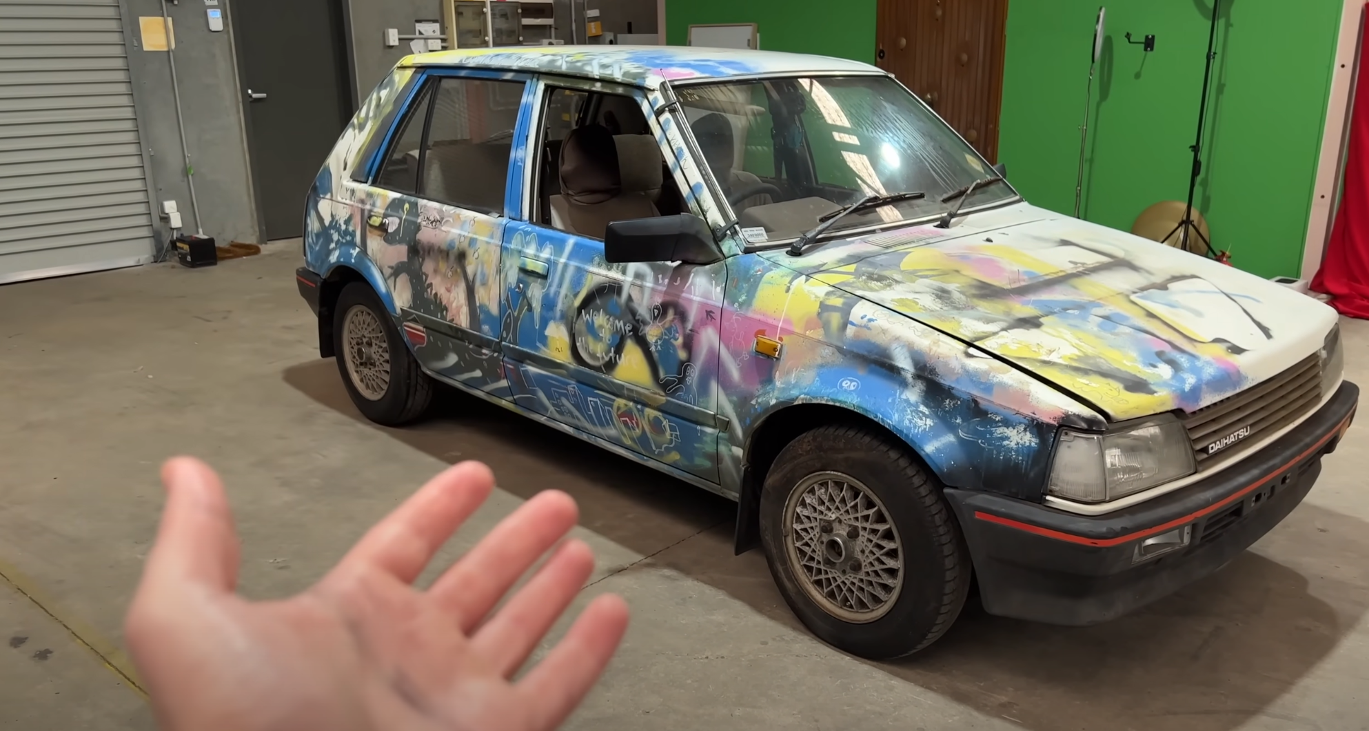 Its an old Daihatsu Charade that they are trying to get running again. Its got unique paintwork and the engine got rebuilt.