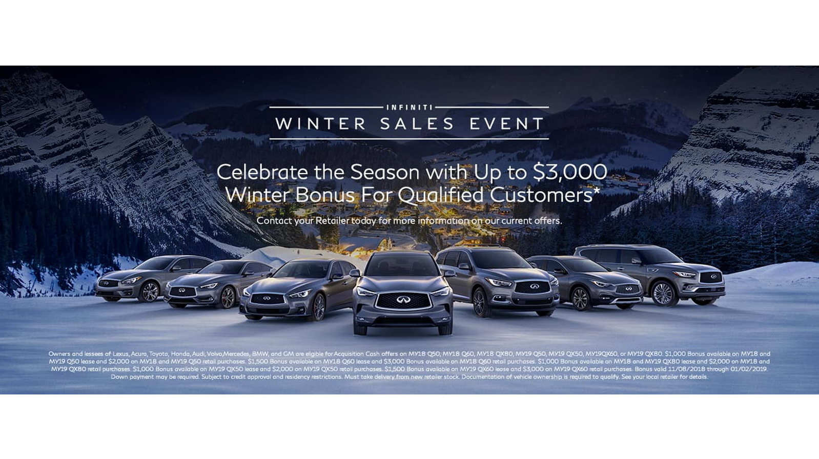 Infinitarians have based a lot of their holiday saleabrations and traditions on the Mercedes-Benzic minimalist holiday traditions but have made the pointed change of including "Sales" into their Winter Event, to prevent the holiday from getting too de-commercialized, an issue Infinitiarians have noted in other manufacturer's saleabrating tradtions.