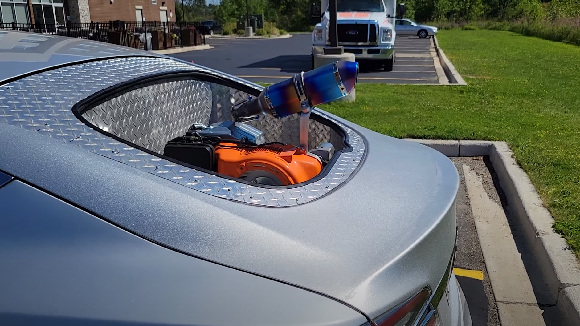 To the credit of Warped Perception, the quality of the build is way above what I was expecting when I clicked the link to watch the video. The generator itself sits in the space where the Tesla's rear cargo area used to be. It lives in an open-topped diamond plate box to keep weather and fumes out of the car's cabin.
